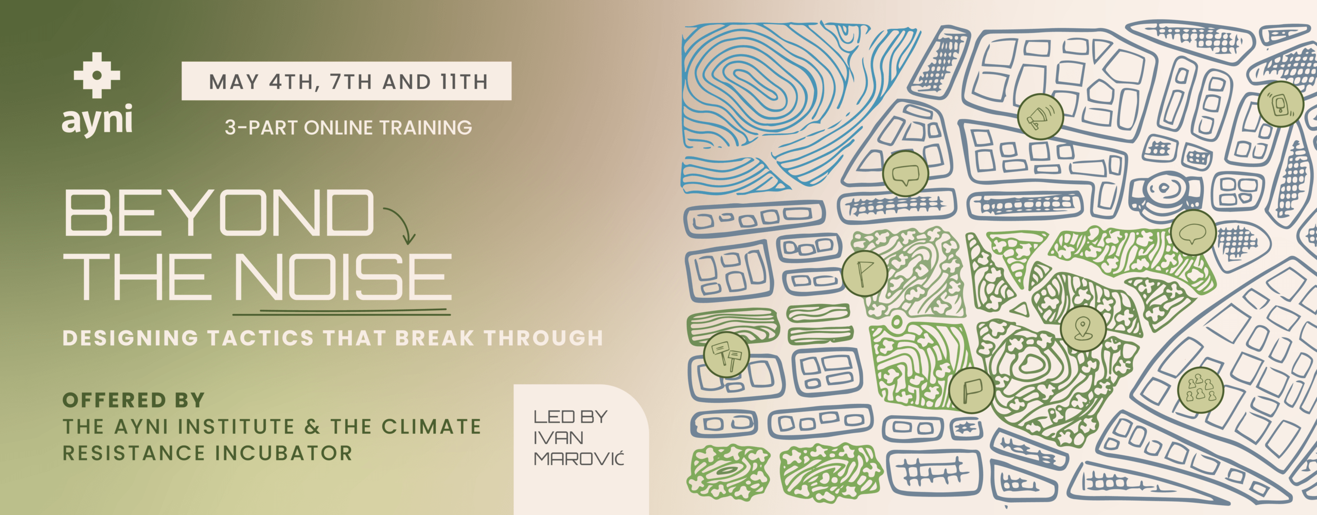 This training is offered by the Ayni Institute in collaboration with the Climate Resistance Incubator and is led by Ivan Marović, one of the leaders of the Serbian student movement Otpor! and author of The Path of Most Resistance: A Step by Step Guide to Planning Nonviolent Campaigns.